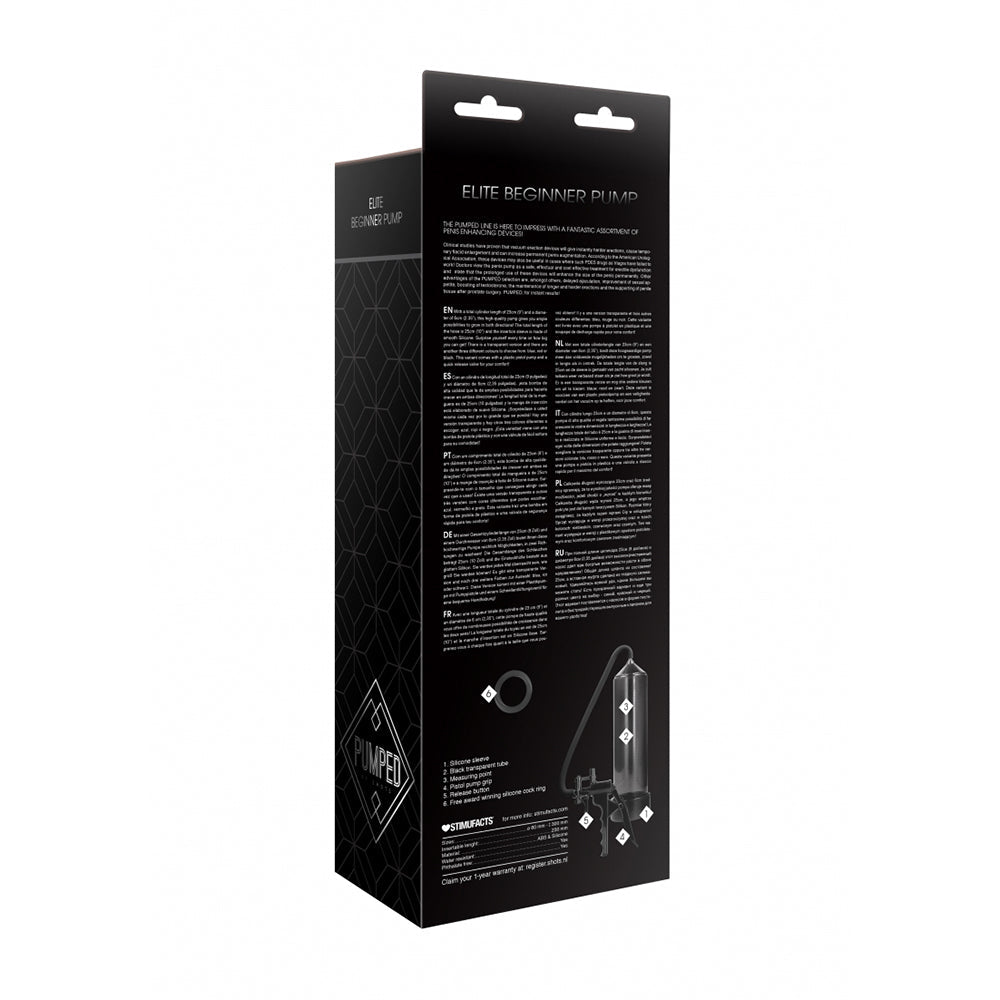 Feel confident, connected, and relaxed with the innovative Elite Beginner Pump. Crafted with non-toxic, body-safe materials, Elite Beginner Pump promotes self-discovery, stress relief, and sexual confidence. Its ergonomic design and powerful vibrations enhance intimacy while supporting holistic wellness. Whether you're flying solo or connecting with a partner, Elite Beginner Pump is a perfect addition to your daily wellness routine. Elite Beginner PumpTHE PUMPED LINE IS HERE TO IMPRESS WITH A FANTASTIC ASSORTMENT OF PENIS ENHANCING DEVICES! With a total cylinder length of 23cm (9") and a diameter of 6cm (2.35"), this high-quality pump gives you ample possibilities to grow in both directions! The total length of the hose is 25cm (10") and the insertion sleeve is made of smooth Silicone. Surprise yourself every time on how big you can get! There is a transparent version and there are another three different colours to choose from: blue, red or black. This variant comes with a plastic pistol grip pump and a quick release valve for your comfort!