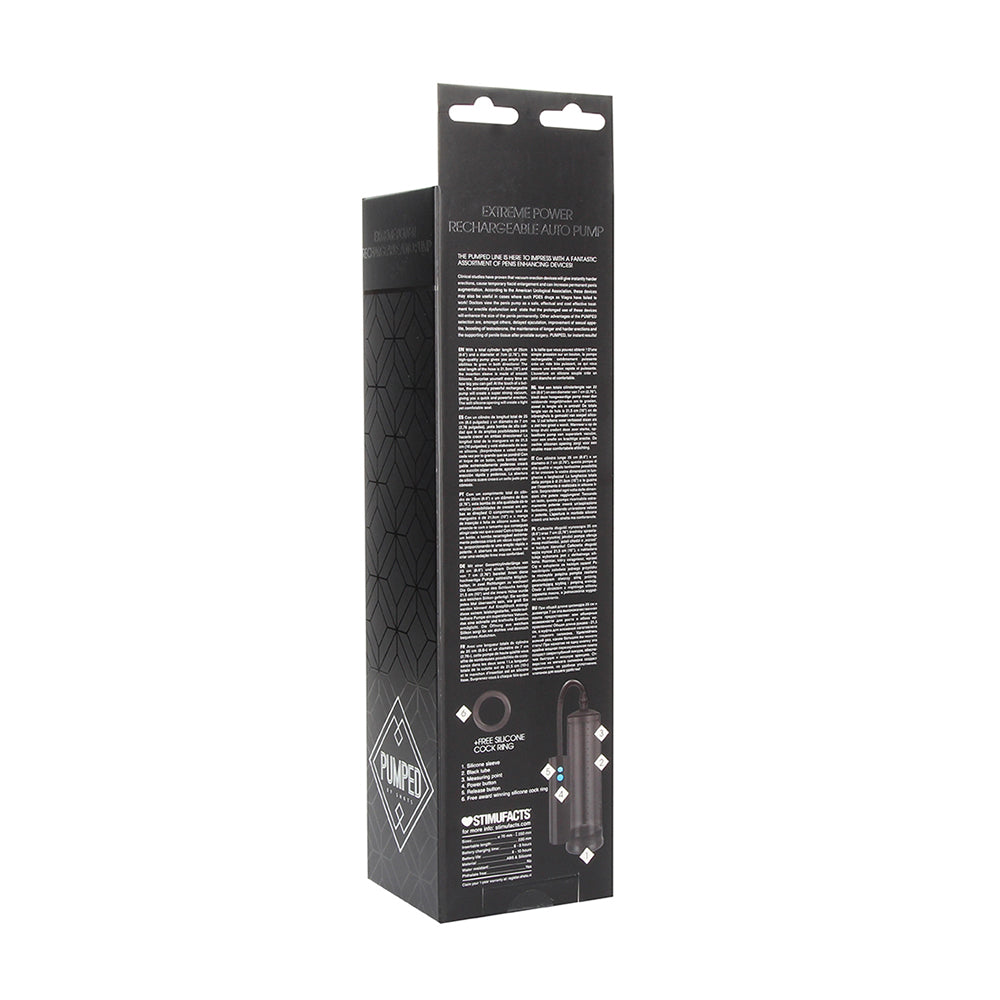 Enhance your sexual wellness journey with the expertly crafted Extreme Power Rechargeable Auto Pump. Crafted with non-toxic, body-safe materials, Extreme Power Rechargeable Auto Pump promotes self-discovery, stress relief, and sexual confidence. Its ergonomic design and powerful vibrations enhance intimacy while supporting holistic wellness. Whether you're flying solo or connecting with a partner, Extreme Power Rechargeable Auto Pump is a perfect addition to your daily wellness routine. Extreme Power Rechargeable Auto PumpThe PUMPED line is here to impress with a fantastic assortment of penis enhancing devices! Clinical studies have proven that vacuum erection devices will give instantly harder erections, cause temporary flacid enlargement and can increase permanent penis augmentation. According to the American Urological Association, these devices may also be useful in cases where such PDE5 drugs as Viagra have failed to work! Doctors view the penis pump as a safe, effectual and cost effective treatment for erectile dysfunction and state that the prolonged use of these devices will enhance the size of the penis permanently. Other advantages of the PUMPED selection are, amongst others, delayed ejaculation, improvement of sexual appetite, boosting of testosterone, the maintenance of longer and harder erections and the supporting of penile tissue after prostate surgery. PUMPED, for instant results!With a total cylinder length of 25cm (9.6") and a diameter of 7cm (2.76"), this high-quality pump gives you ample possibilities to grow in both directions! The total length of the hose is 21.5cm (10") and the insertion sleeve is made of smooth Silicone. Surprise yourself every time on how big you can get! At the touch of a button, the extremely powerful rechargeable pump will create a super strong vacuum, giving you a quick and powerful erection. The soft silicone opening will create a tight yet comfotable seal.