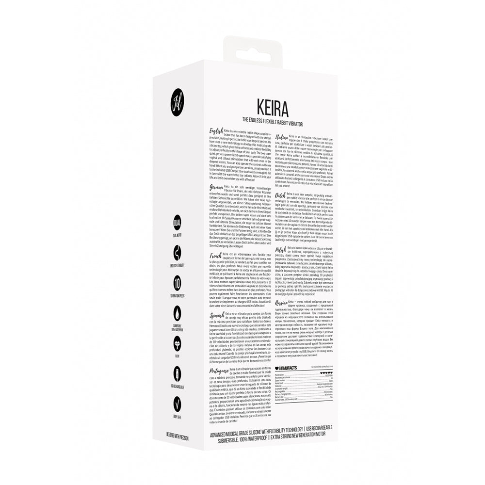 Keira is designed to empower pleasure and support intimate well-being. Crafted with non-toxic, body-safe materials, Keira promotes self-discovery, stress relief, and sexual confidence. Its ergonomic design and powerful vibrations enhance intimacy while supporting holistic wellness. Whether you're flying solo or connecting with a partner, Keira is a perfect addition to your daily wellness routine. KeiraJìl brings sensual appearance unlike any other. Keira is a very nimble rabbit-shape couples vibrator that has been designed with the utmost precision, making it perfect to fulfill your deepest desires. We have used a new technology to develop this medical grade silicone toy, which gives Keira softness and endless flexibility to adjust perfectly to the shape of your body. The two super quiet, yet very powerful 10-speed motors provide satisfying vaginal and clitoral stimulation that will work even in the deepest waters. You can also operate the controls with one hand! When you and your partner are done, simply connect it to the included USB Charger. One touch will be enough to fall in love with the warmth this toy radiates. Allow Jìl into your life and let it overwhelm you with affection!Features:Advanced medical grade silicone with flexibilty technologyUSB RechargeableSubmersible, 100% WaterproofExtra strong new generation motorKeira, The endless flexible rabbit vibrator
