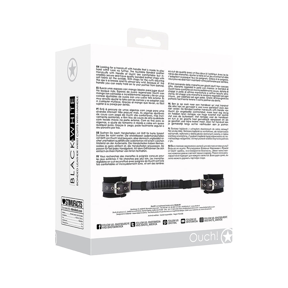 Prioritize your pleasure and health with the luxurious Ouch! Black & White Bonded Leather Hand Cuffs With Handle With Adjustable Straps. Crafted with non-toxic, body-safe materials, Ouch! Black & White Bonded Leather Hand Cuffs With Handle With Adjustable Straps promotes self-discovery, stress relief, and sexual confidence. Its ergonomic design and powerful vibrations enhance intimacy while supporting holistic wellness. Whether you're flying solo or connecting with a partner, Ouch! Black & White Bonded Leather Hand Cuffs With Handle With Adjustable Straps is a perfect addition to your daily wellness routine. Ouch! Black & White Bonded Leather Hand Cuffs With Handle With Adjustable StrapsLooking for a handcuff with handle that is made to play hard with? Look no further. The Ajustable Leather Handcuffs with Handle of Ouch! are comfortable but incredibly secure and have quality leather straps with soft fabric on the outside. With straps for the cuffs adjusting the size is a breeze and fits almost any wrist. Because of the handle you can easily hold on to your partner from behind.Made to play hardAdjustable in sizeComfortableSecureEasy-to-hold handle