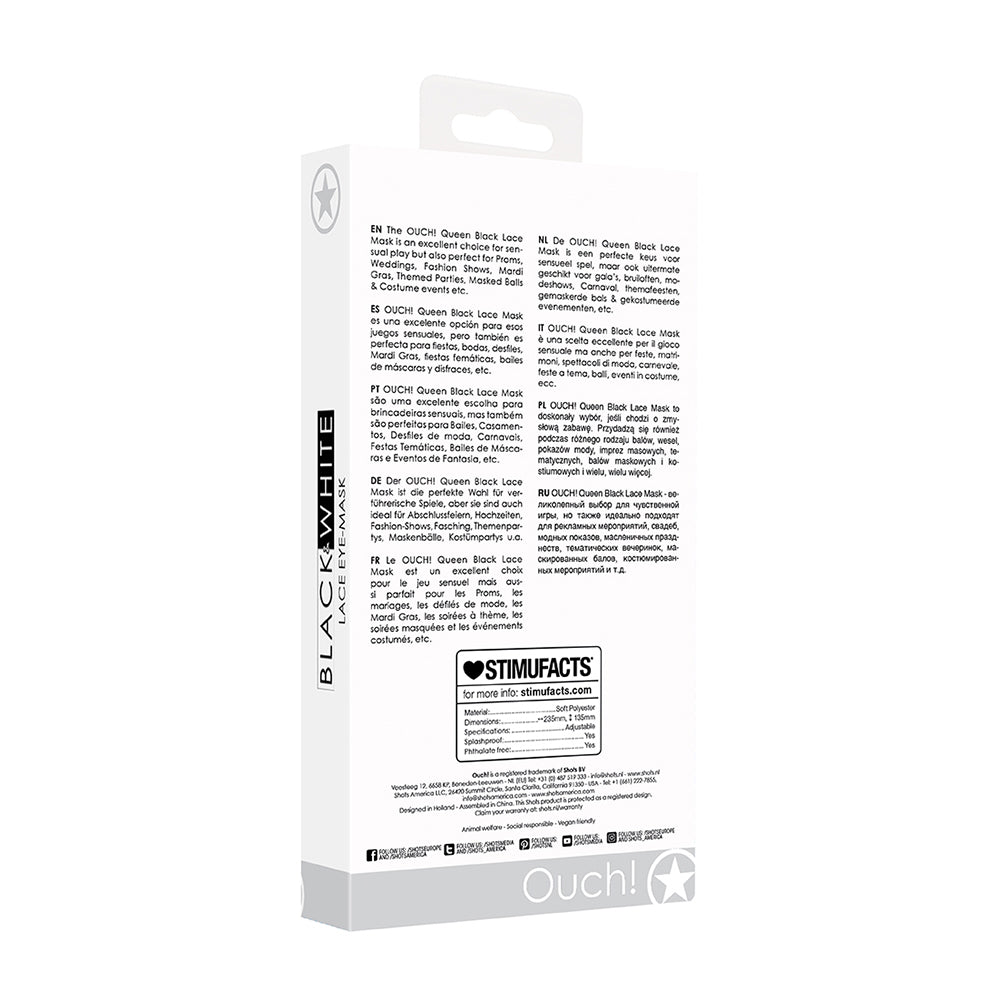Ouch! Black & White Lace Eye Mask Queen is designed to empower pleasure and support intimate well-being. Crafted with non-toxic, body-safe materials, Ouch! Black & White Lace Eye Mask Queen promotes self-discovery, stress relief, and sexual confidence. Its ergonomic design and powerful vibrations enhance intimacy while supporting holistic wellness. Whether you're flying solo or connecting with a partner, Ouch! Black & White Lace Eye Mask Queen is a perfect addition to your daily wellness routine. Ouch! Black & White Lace Eye Mask QueenOUCH! Present’s a series of 4 handmade, high quality, lightweight and easy to wear masks, detailed with intricate modern Venetian inspired designs. Created with laser-cutting technology from the finest, eco-friendly materials, these masks will really give you an air of seductive mystery! Two quality ribbons will secure the mask in place for long hours of comfortable wear or play and facilitate easy adjustment. The OUCH! Queen Black Lace Mask is an excellent choice for sensual play but also perfect for Proms, Weddings, Fashion Shows, Mardi Gras, Themed Parties, Masked Balls & Costume events etc.High quality, lightweight and easy to wear eye maskDetailed with intricate modern, Venetian inspired designsTwo quality ribbons will secure that the mask stays in placeMade of Polyester