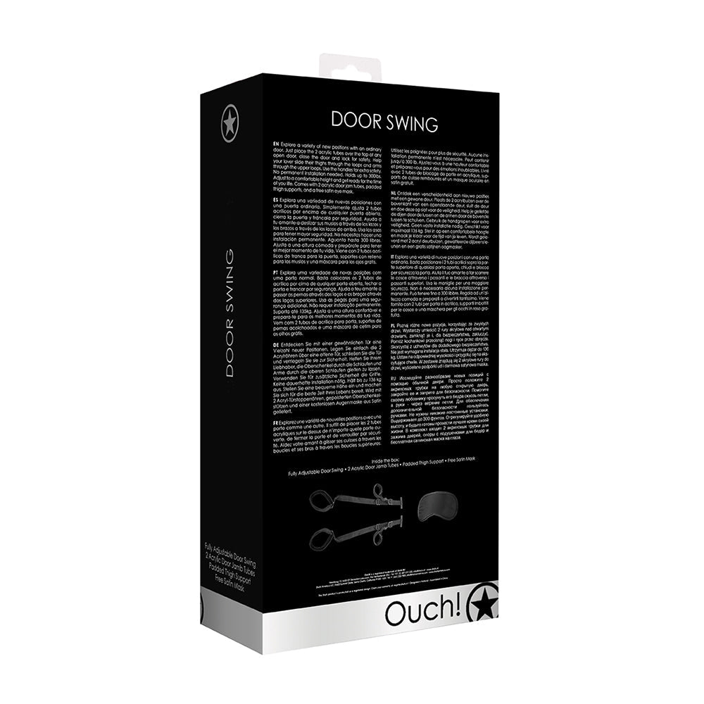 Prioritize your pleasure and health with the luxurious Ouch! Door Swing. Crafted with non-toxic, body-safe materials, Ouch! Door Swing promotes self-discovery, stress relief, and sexual confidence. Its ergonomic design and powerful vibrations enhance intimacy while supporting holistic wellness. Whether you're flying solo or connecting with a partner, Ouch! Door Swing is a perfect addition to your daily wellness routine. Ouch! Door SwingExplore a variety of new positions with an ordinary door. Just place the 2 acrylic tubes over the top of any open door, close the door and lock for safety. Help your lover slide their thighs through the loops and arms through the upper loops. Use the handles for extra safety. No permanent installation needed. Holds up to 300kg/661lbs. Adjust to a comfortable height and get ready for the time of you life. Comes with 2 acrylic door jam tubes, padded thigh supports, and a free satin eye mask.