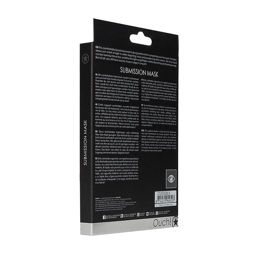 Discover body-safe bliss and mindful self-care with Ouch! Submission Mask. Crafted with non-toxic, body-safe materials, Ouch! Submission Mask promotes self-discovery, stress relief, and sexual confidence. Its ergonomic design and powerful vibrations enhance intimacy while supporting holistic wellness. Whether you're flying solo or connecting with a partner, Ouch! Submission Mask is a perfect addition to your daily wellness routine. Ouch! Submission MaskThis comfortable Submission mask is designed to stretch completely over the head and closes easily at the back with a zipper. The fabric allows just a hint of light in while impairing vision and awakening other senses. The shiny hood can be worn by him or her, and the thin lightweight fabric makes breathing and hearing a snap. Best of all, you still have access to your subject's mouth!
