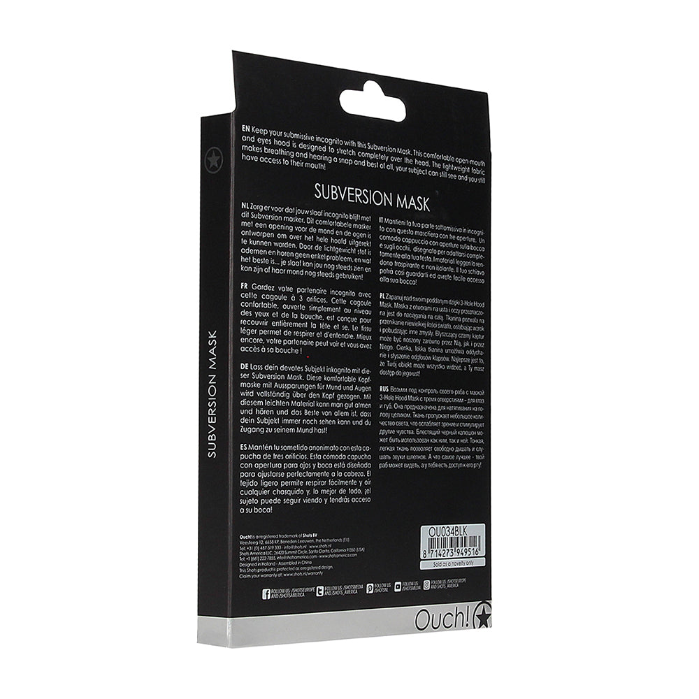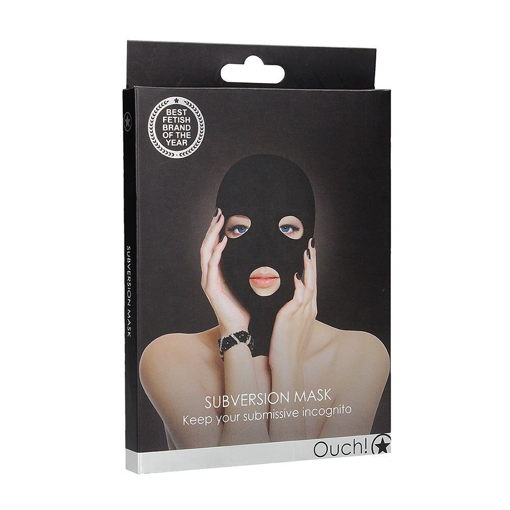 Prioritize your pleasure and health with the luxurious Ouch! Subversion Mask. Crafted with non-toxic, body-safe materials, Ouch! Subversion Mask promotes self-discovery, stress relief, and sexual confidence. Its ergonomic design and powerful vibrations enhance intimacy while supporting holistic wellness. Whether you're flying solo or connecting with a partner, Ouch! Subversion Mask is a perfect addition to your daily wellness routine. Ouch! Subversion MaskKeep your submissive incognito with this 3-Hole Hood Mask. This comfortable open-mouth and eyes hood is designed to stretch completely over the head and closes easily at the back with a zipper. The lightweight fabric makes breathing and hearing a snap and best of all, your subject can still see and you still have access to their mouth!
